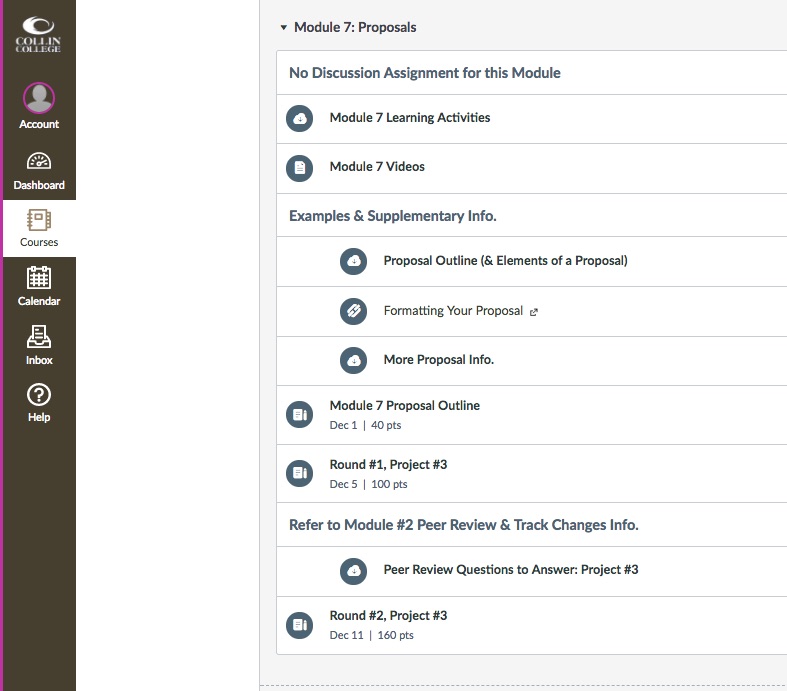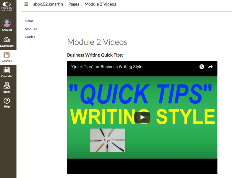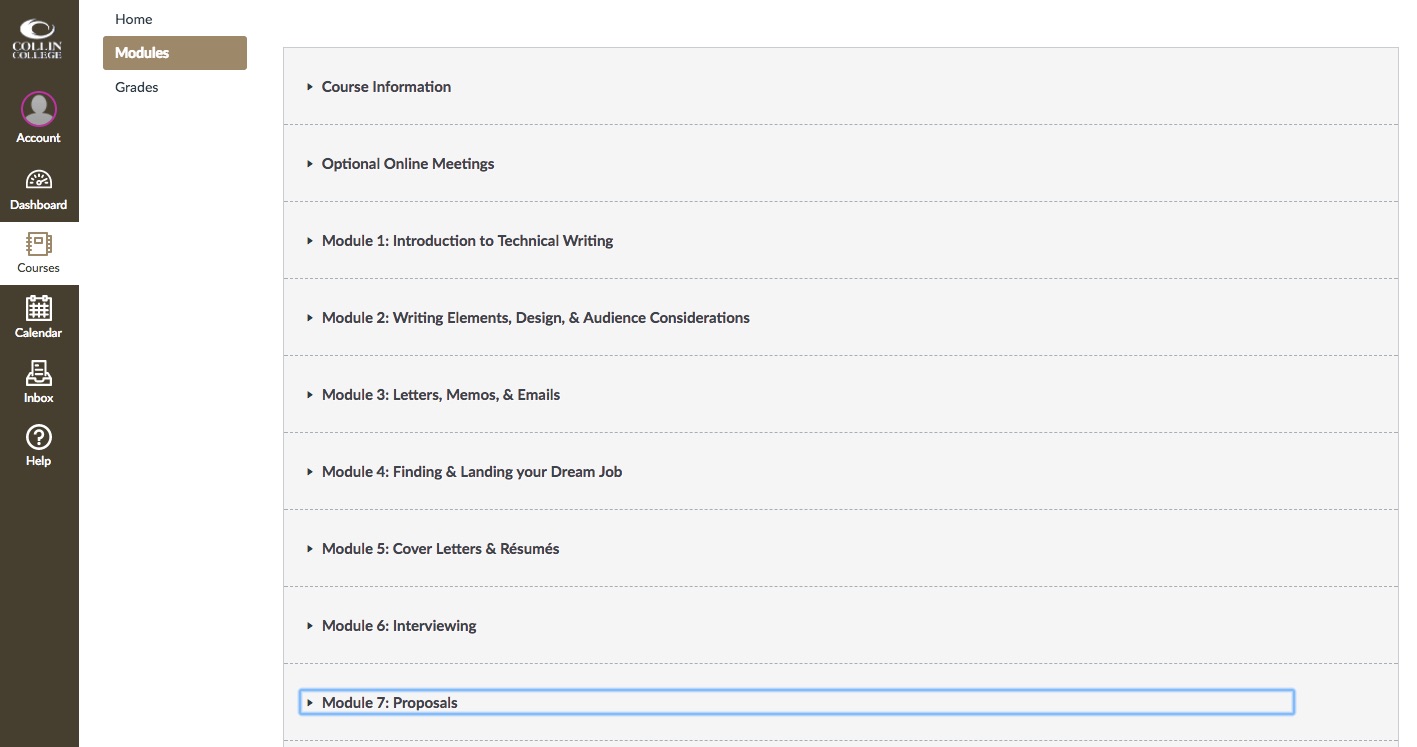 The above screenshots are from an academic Canvas course designed for students who are pursuing an associate's degree or a certification or license in a vocational field. Specifically, English 2311: Business and Technical Writing is part of the first-year writing program at Collin College, located near Dallas-Ft. Worth. The course includes eight modules, ranging in topics from technical writing standards, to the composition of proposals, to using social media sites for professional purposes. The course also features a variety of learning activities and assessments, as well as multimedia resources.