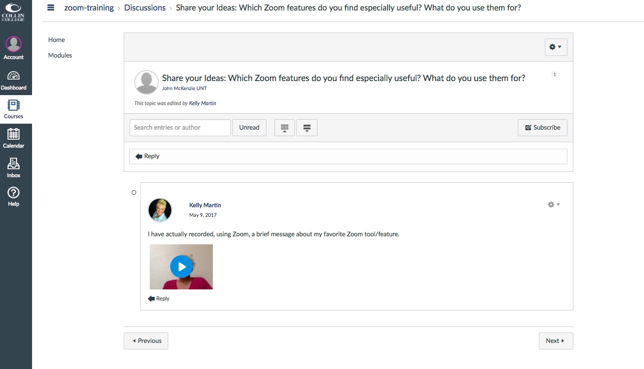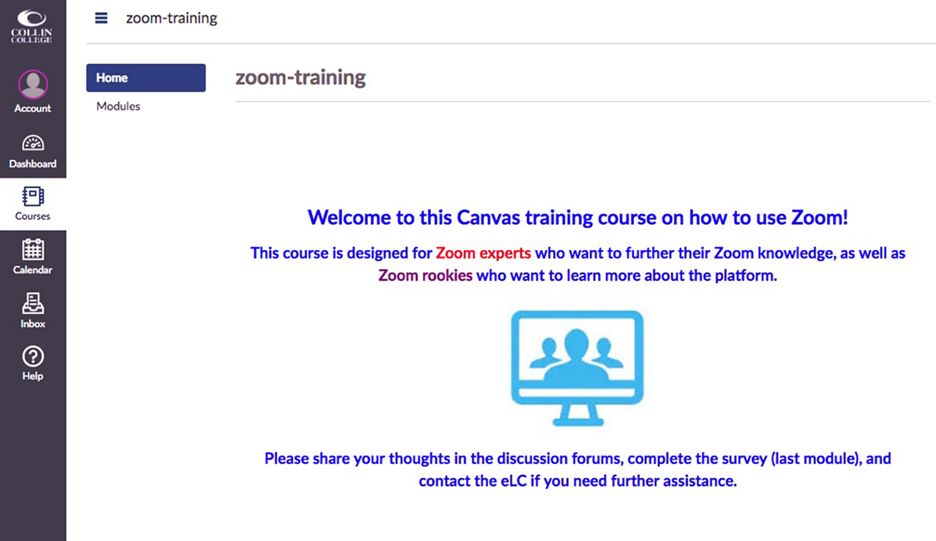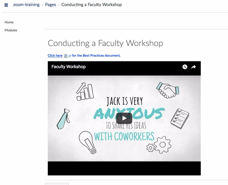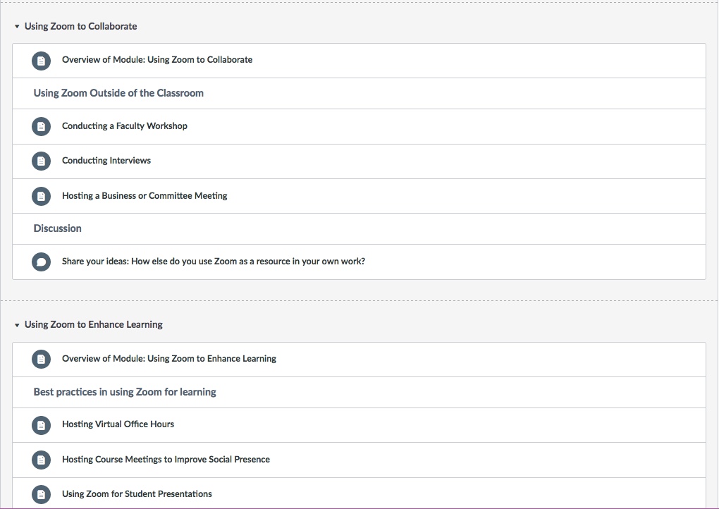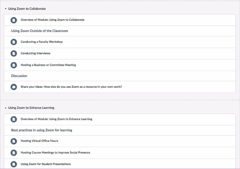 These thumbnails are representative of the design and features of a Canvas training course dedicated to the professional development of Collin College faculty and staff who want to learn about, or broaden their knowledge of, the videoconferencing platform, Zoom.